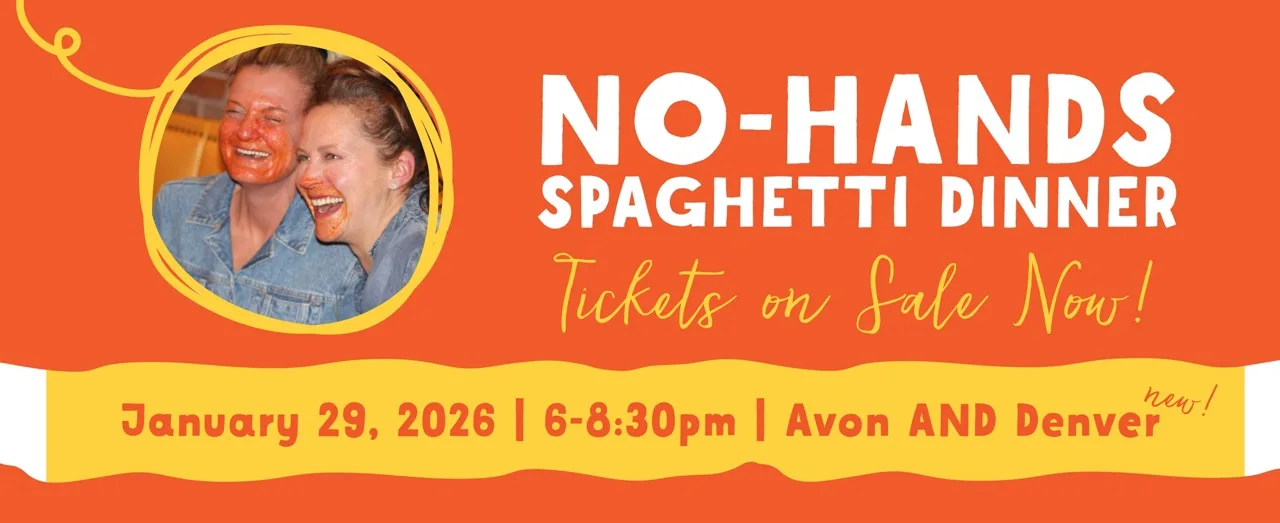 Thumbs up, faces down! 🍝 Tickets are on sale NOW for No-Hands Spaghetti Dinner – happening simultaneously in Denver and the Vail Valley on Thursday, January 29th from 6-8:30PM! Get ready for our fourth annual event in the Vail Valley, and inaugural No-Hands Spaghetti Dinner in Denver! 🎉